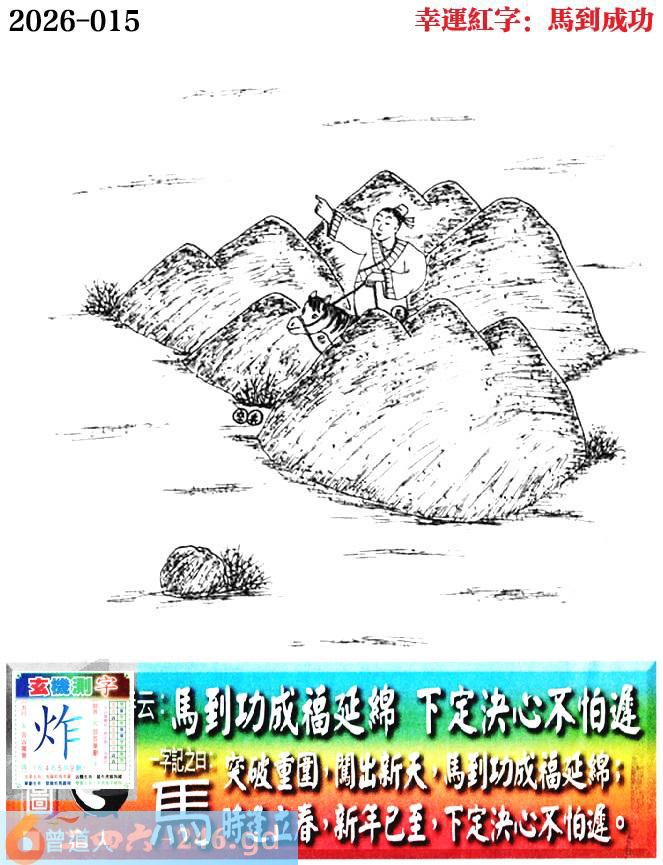 015期老版跑狗一字記之曰:【馬】 詩雲:馬到成功福延綿,下定決心不怕遲。 突破重圍,闖出新天,馬到成功福延綿; 時逢立春,新年已至,下定決心不怕遲。 玄機測字:《炸》