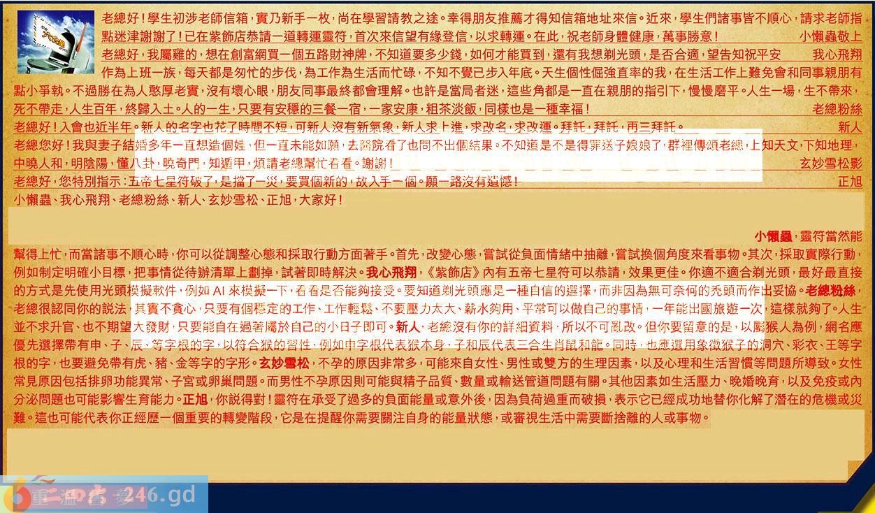 第120期《六合皇信箱文字版》10000%正確!!!正版二四六論壇*精心製作!!! 小懶蟲、我心飛翔、老總粉絲、新人、玄妙雪松、正旭,大家好! 【1】.老總好!學生初涉老師信箱,實乃新手一枚,尚在學習請教之途。幸得朋友推薦才得知信箱地址來信。近來,學生們諸事皆不順心,請求老師指點迷津謝謝了!已在紫飾店恭請一道轉運靈符,首次來信望有緣登信,以求轉運。在此,祝老師身體健康,萬事勝意!小懶蟲敬上 〖小懶蟲〗:靈符當然能幫得上忙,而當諸事不順心時,你可以從調整心態和採取行動方面著手。首先,改變心態,嘗試從負面情緒中抽離,嘗試換個角度來看事物。其次,採取實際行動,例如制定明確小目標,把事情從待辦清單上劃掉,試著即時解決。 【2】.老總好,我屬雞的,想在創富網買一個五路財神牌,不知道要多少錢,如何才能買到,還有我想剃光頭,是否合適,望告知祝平安我心飛翔 〖我心飛翔〗:《紫飾店》內有五帝七星符可以恭請,效果更佳。你適不適合剃光頭,最好最直接的方式是先使用光頭模擬軟件,例如來模擬一下看看是否能夠接受。要知道剃光頭應是一種自信的選擇,而非因為無可奈何的禿頭而作出妥協。 【3】.作為上班一族,每天都是匆忙的步伐,為工作為生活而忙碌,不知不覺已步入年底。天生個性倔強直率的我,在生活工作上難免會和同事親朋有點小爭執。不過勝在為人憨厚老實,沒有壞心眼,朋友同事最終都會理解。也許是當局者迷,這些角都是一直在親朋的指引下,慢慢磨平。人生一場,生不帶來,死不帶走,人生百年,終歸入土。人的一生,只要有安穩的三餐一宿,一家安康,粗茶淡飯,同樣也是一種幸福!老總粉絲 〖老總粉絲〗:老總很認同你的說法,其實不貪心,只要有個穩定的工作工作輕鬆、不要壓力太大、薪水夠用、平常可以做自己的事情,一年能出國旅遊次,這樣就夠了。人生並不求升官、也不期望大發財,只要能自在過著屬於自己的小日子即可。 【4】.老總好!入會也近半年。新人的名字也花了時間不短,可新人沒有新氣象,新人求上進,求改名,求改運。拜託,拜託,再三拜話。新人 〖新人〗:老總沒有你的詳細資料,所以不可亂改。但你要留意的是,以屬猴人為例,網名應優先選擇帶有申、子、辰、等字根的字,以符合猴的習性,例如申字根代表猴本身,子和辰代表三合生肖鼠和龍。同時,也應選用象徵猴子的洞穴、彩衣、王等字根的字,也要避免帶有虎、猪、金等字的字形。 【5】.老總您好!我與妻子結婚多年一直想造個娃,但一直未能如願,去醫院看了也問不出個結果。不知道是不是得罪送子娘娘了,群裡傳頌老總,上知天文,下知地理,中曉人和,明陰陽,懂八卦,曉奇門,知遁甲,煩請老總幫忙看看。謝謝!玄妙雪松影 〖玄妙雪松〗:不孕的原因非常多,可能來自女性、男性或雙方的生理因素,以及心理和生活習慣等問題所導致。女性常見原因包括排卵功能異常、子宮或卵巢問題。而男性不孕原因則可能與精子品質、數量或輸送管道問題有關。其他因素如生活壓力、晚婚晚育,以及免疫或內分泌問題也可能影響生育能力。 【6】.老總好,您特別指示:五帝七星符破了,是擋了一货,要買個新的,故入手一個。願一路沒有遺憾!正旭 〖正旭〗:你說得對!靈符在承受了過多的負面能量或意外後,因為負荷過重而破損,表示它已經成功地替你化解了潛在的危機或災難。這也可能代表你正經歷一個重要的轉變階段,它是在提醒你需要關注自身的能量狀態,或審視生活中需要斷捨離的人或事物。 紅字:重溫舊夢 暗码:01293542 [释义]比喻再经历一次过去的光景。 [出处]清·丘逢甲《岭云每日楼诗钞·重过感旧园二首》诗:“水木清华负郭园,三年客梦此重温。眼中故物诗留壁,身后浮文酒满樽。”