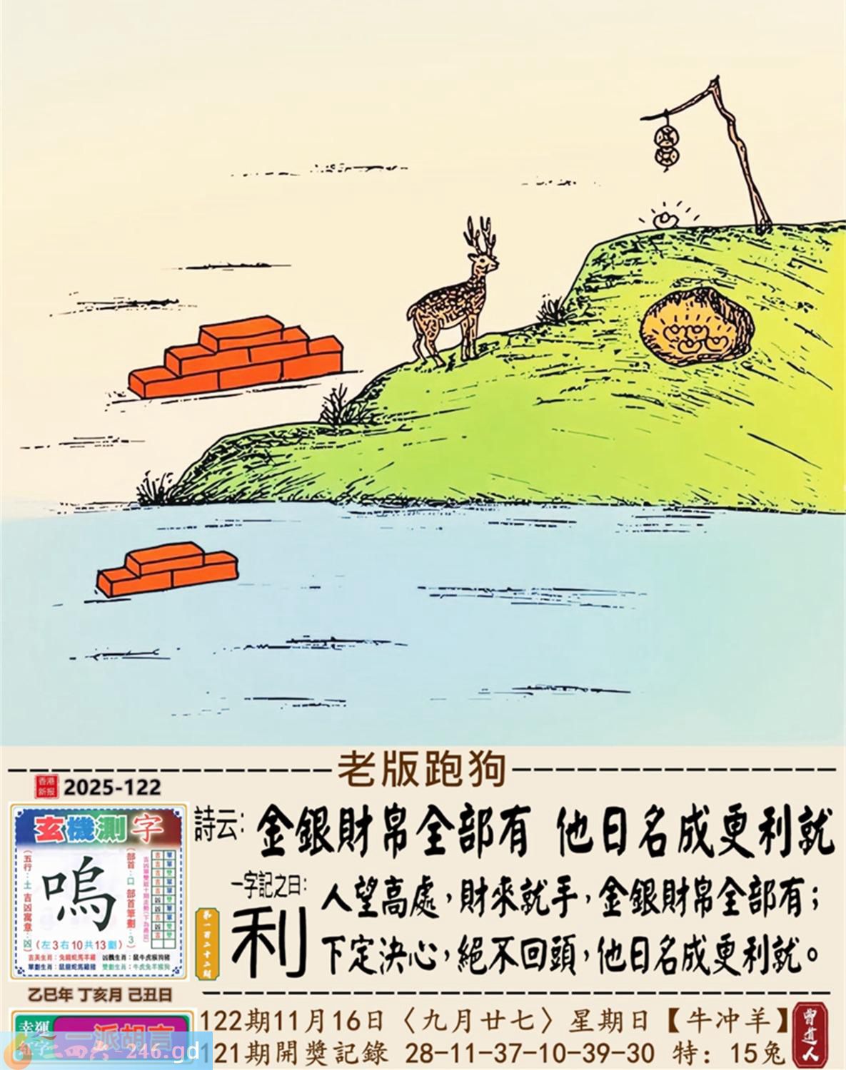 2025年11月16日122期羊(癸未)(霹雷火) 122期:老版跑狗玄機一字記之曰:【利】 詩云:金銀財帛全部有他日名成更利就 人望高處,財來就手,金銀財帛全部有; 下定決心,絕不回頭,他日名成更利就。 玄機測字:《鳴》 密圖詩:一口咬定八當寶 《記》:三思而行四方面 特碼大小單雙句:人前人后各一套 今期必中:孫策 122期:特碼歇后語 当了衣裳打酒喝-----顾嘴不顾身 122期正版四字梅花诗:十全十美。 122期火车头:烧伤狗。诗:羊死鸡伤,开过一门又一门。 122期香港第一手欲钱料:村夫俗子。 122期曾道人说:“王老吉?” 122期另版四字梅花诗:盖世豪情。 122期香港第一手欲钱料:欲钱看西游记第三回。 122期曾道人说:“男人三十喝酒时喜欢做什么事”? 122期:二字經:三十 122期:平果是特码 122期:智力金壤:勇往直前 122期:信箱紅字:【吹灰之力】 122期:【暗碼:14-21-28-41】 122期:一語中特:【三言兩語】 發財玄機圖:四蹄翻腾精神健旺圖中明馬紅綠 122期:藏寳圖 新:割鲜籍草酒淋漓 老:日暮沙场飞作灰 禁:猴禁:0尾玄機字《将》 2025年122期【生活幽默】版 〖表現很好〗 有一個精神病患者救了一個落水者。 院長非常高興,對這個精神病患者說:“這次你救了一個落水的人,表現很好,但不幸的是他不知道什麽是原因又上吊自殺了。” 精神病很得意的說:“是我把他挂起來要晾幹的!”