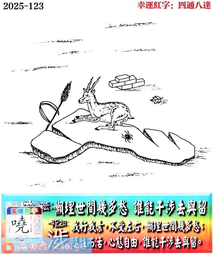 123期老版跑狗一字記之曰:【涉】 詩雲:懶理世間幾多愁,誰能干涉去與留。 我行我素,不受左右,懶理世間幾多愁; 隨性而活,心態自由,誰能干涉去與留。 玄機測字:《嘵》