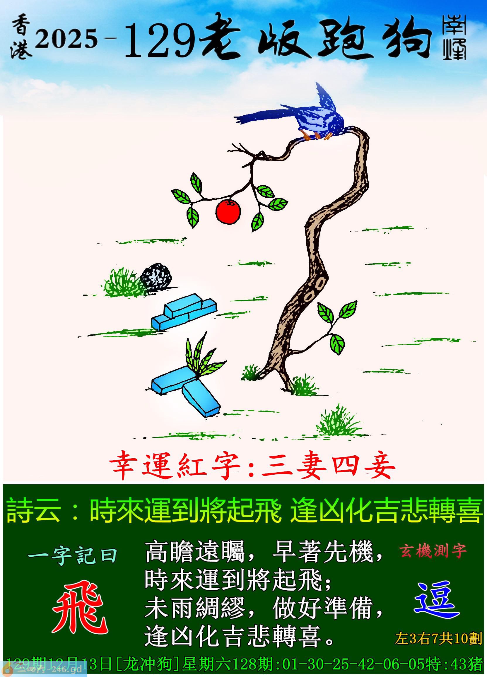本帖最后由星云探码于2025-12-1302:33编辑 129期老版跑狗一字記之曰:【飛】 詩雲:時來運到將起飛,逢凶化吉悲轉喜。高瞻遠矚,早著先機,時來運到將起飛; 未雨綢繆,做好準備,逢凶化吉悲轉喜。 玄機測字:《逗》 高瞻遠矚,龙;早著先機,鼠; 未雨綢繆,猪;做好準備,马; 時來運到將起飛;龙日; 逢凶化吉悲轉喜,猴、牛;