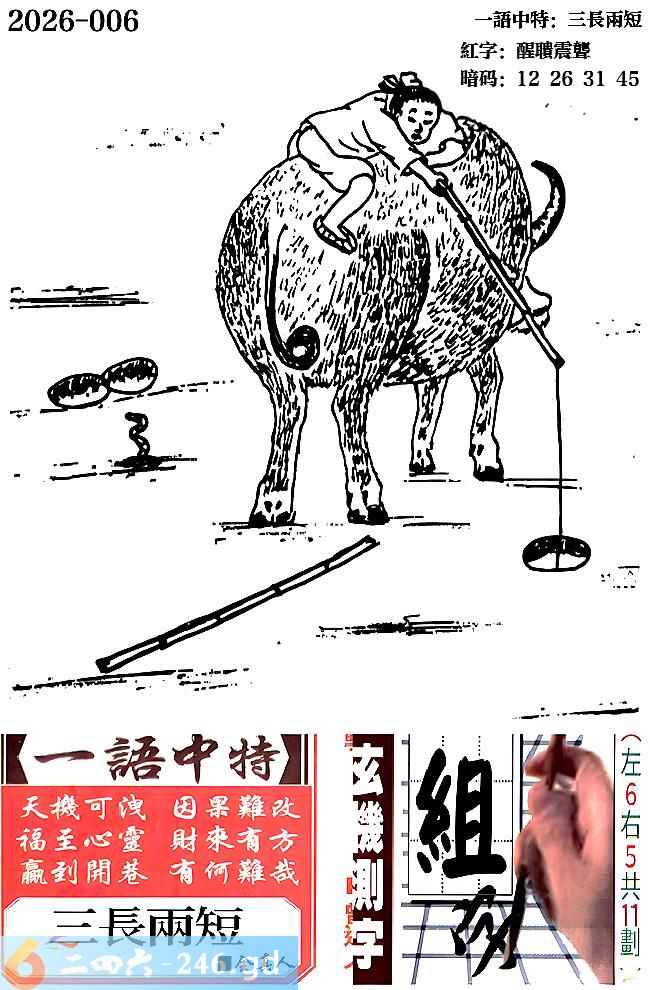 006期跑狗一字記之曰:【釣】 牛背斜身,長竿稱釣。 坑多魚少,尋得壹歡。 玄機測字:《組》 一語中特:三長兩短