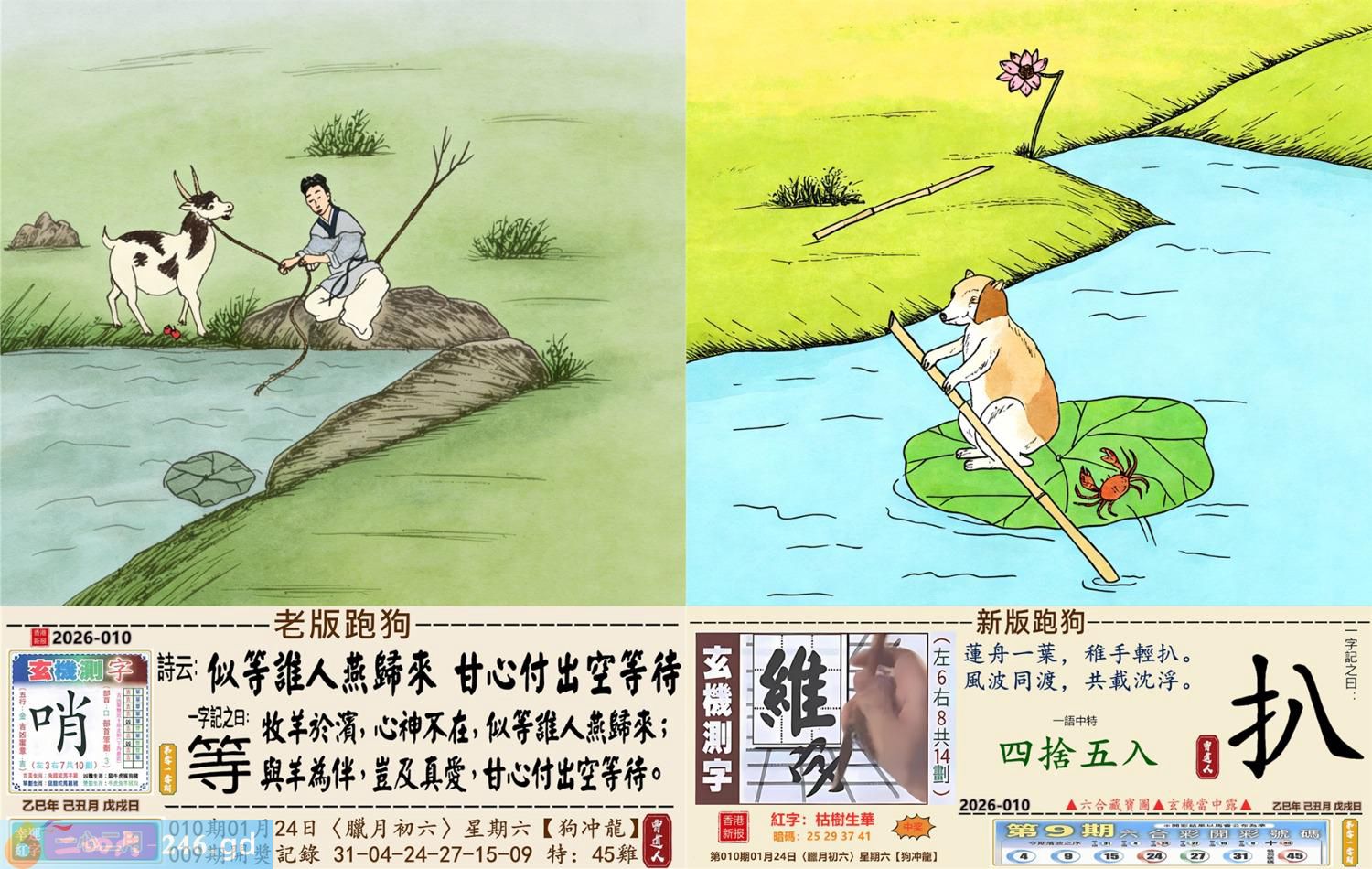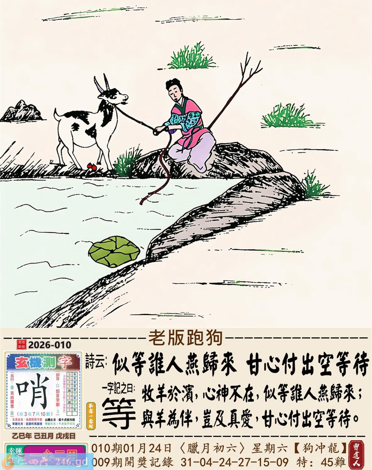 2026年1月24日010期龙(壬辰)(平地木) 010期:老版跑狗玄機一字記之曰:【等】 詩云:似等誰人燕歸來甘心付出空等待 牧羊於濱,心神不在,似等誰人燕歸來; 與羊為伴,豈及真愛,甘心付出空等待。 玄機測字:《哨》 密圖詩:山中無老虎 《記》:三門自有九尾數 特碼大小單雙句:抱着老婆暖被窩 今期必中:貂禪 010期:特碼歇后語 枣木疙瘩-----越老越结实 010期正版四字梅花诗:大张旗鼓。 010期火车头:烧伤马。诗:羊死龙伤,四书五经读一生。 010期香港第一手欲钱料:火。 010期曾道人说:“九?” 010期另版四字梅花诗:新春多福。 010期香港第一手欲钱料:欲钱找红色的动物。 010期曾道人说:“为什么春节期间家家户户都要放鞭炮呢”? 010期:二字經:深村 010期:路口有特码 010期:智力金壤; 010期:信箱紅字:【枯樹生華】 010期:【暗碼:25-29-37-41】 010期:一語中特:【四捨五入】 發財玄機圖:舐犢情深體型龐大圖中明牛藍綠 010期:藏寳圖 新:同向尘中叁拾载 老:秋槐叶落空宫里 禁:虎禁:1尾玄機字《辑》 2026年010期【生活幽默】版 〖分家産〗 一個富人快死了,分别给兩個兒子一把很鈍柴刀,説你們去砍一天的柴,誰砍的柴多,我就把家都給他。 大兒子拿了柴刀,急匆匆就上山砍柴去了。 二兒子拿過刀看了看,找了一把磨刀石,開始磨刀。 没過一會兒磨好了,拿着刀進屋對老爸説:"快把錢都拿出來!"