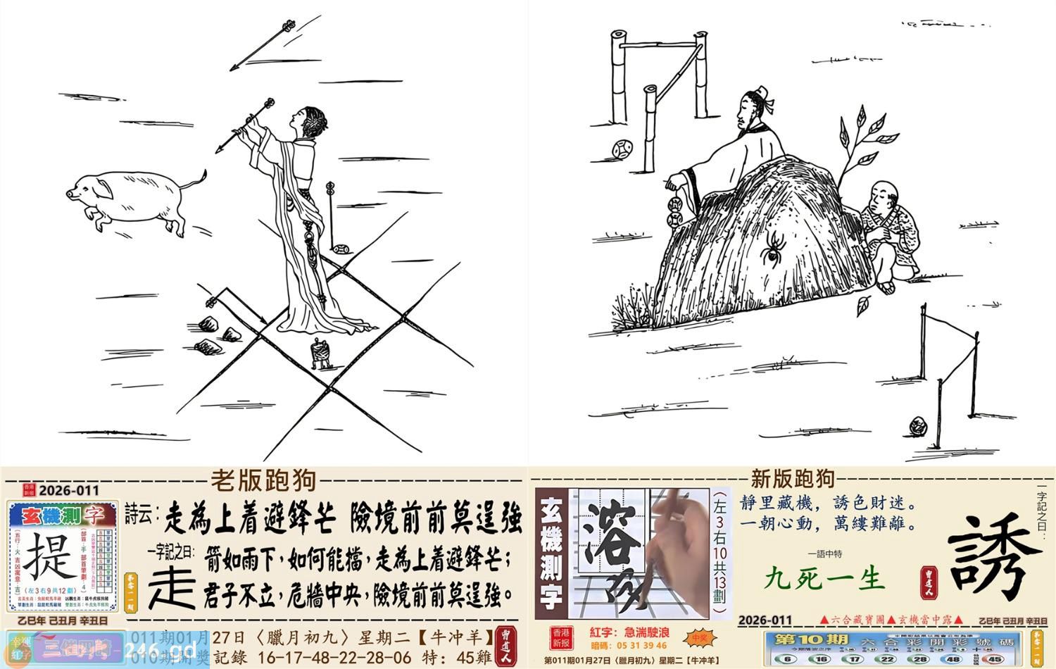 2026年1月27日011期羊(乙未)(壁上土) 011期:老版跑狗玄機一字記之曰:【走】 詩云:走為上着避鋒芒險境前前莫逞強 箭如雨下,如何能擋,走為上着避鋒芒; 君子不立,危牆中央,險境前前莫逞強。 玄機測字:《提》 密圖詩:酒足飯飽去按摩 《記》:同桌對座賽象棋 特碼大小單雙句:一窩鳥蛋有六個 今期必中:趙雲 011期:特碼歇后語 早上没刷牙-----嘴巴不干净 011期正版四字梅花诗:恕不奉陪。 011期火车头:烧伤龙。诗:鸡死猪伤,十二生肖排第四。 011期香港第一手欲钱料:龙? 011期曾道人说:“木?” 011期另版四字梅花诗:四面青山。 011期香港第一手欲钱料:欲钱找伶俐的动物。 011期曾道人说:“为什么每个人都比较喜欢钱呢”? 011期:二字經:好數 011期:电灯是特码 011期:智力金壤;一丝不挂 011期:信箱紅字:【急湍駛浪】 011期:【暗碼:05-31-39-46】 011期:一語中特:【九死一生】 發財玄機圖:冷静守候弓身嘶聲圖中明蛇紅綠 011期:藏寳圖 新:因想后湖题柱处 老:汉城黄柳映新帘 禁:虎禁:4尾玄机字《踌》 2026年011期【生活幽默】版 〖未來岳父〗 今天去女朋友家,心裏异常緊張。 晚上吃飯的時候,未来岳父多喝了兩杯,就跟我:"小李啊,我看你這人很有自信,胸懷寬廣,想必以後必成大器,女兒交給你我也就放心了。"聽得我那個高興,忙問這您也能看出來啊? 他回答道:"我瞧你長得這鳥樣,也敢泡我女兒,説明你這人不簡單。" 我......