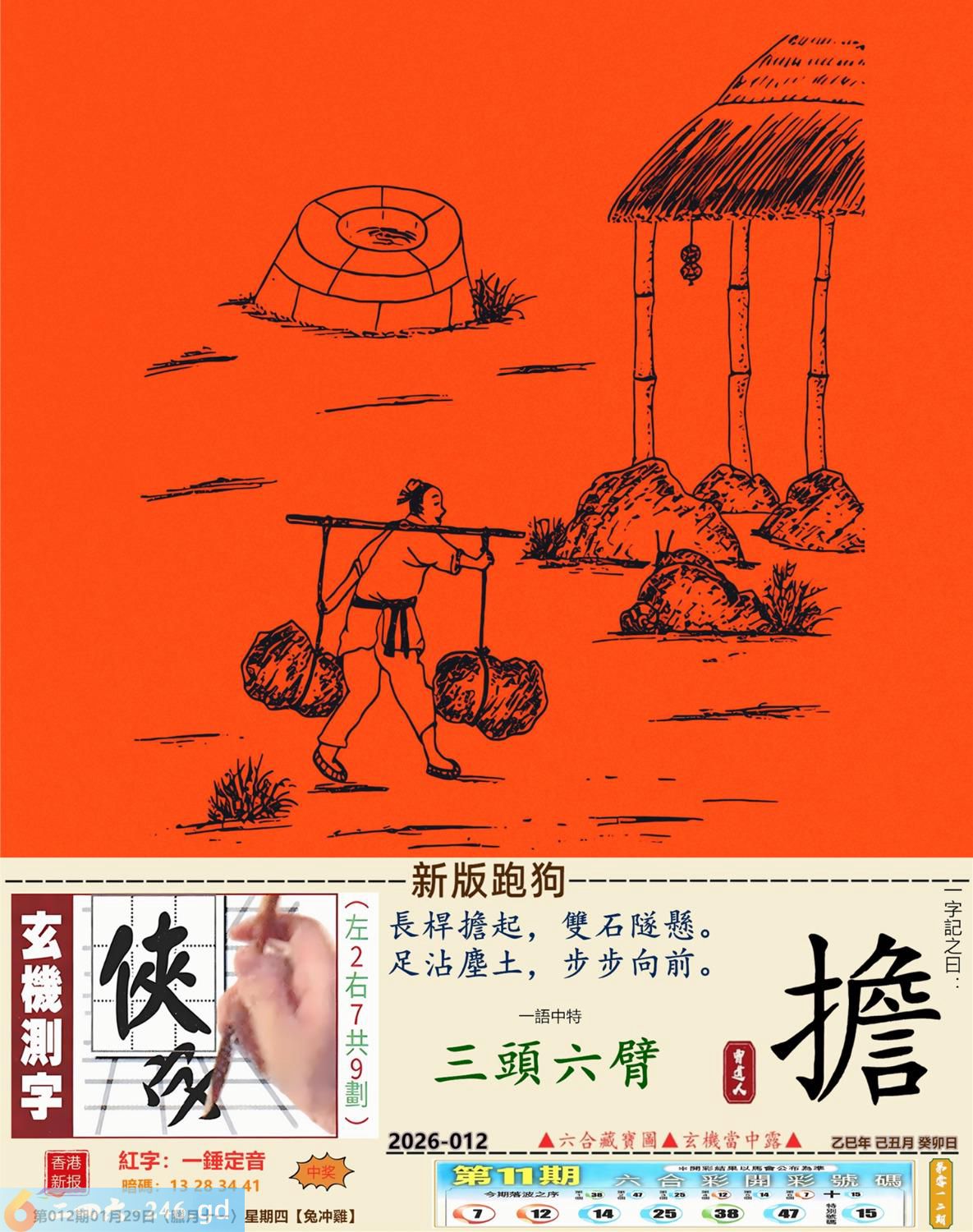 本帖最后由小歪于2026-1-2908:41编辑 2026年1月29日012期鸡(丁酉)(金箔金) 012期:老版跑狗玄機一字記之曰:【高】 詩云:下定決心闖一闖唯怕高處不勝寒 人望高處,勇氣難檔,下定決心闖一闖; 登峰造極,何其風光,唯怕高處不勝寒。 玄機測字:《娃》 密圖詩:竹藍打水一場空 《記》:八仙賀喜到門前 特碼大小單雙句:天天去市場買菜 今期必中:馬超 012期:特碼歇后語 祖奶奶的花鞋-----老式样 012期正版四字梅花诗:三天打鱼。 012期火车头:烧伤马。诗:马死兔伤,二九出特今期来。 012期香港第一手欲钱料:日本? 012期曾道人说:“三个?” 012期另版四字梅花诗:美丽神话。 012期香港第一手欲钱料:欲钱找2005年最后一期的开奖记录。 012期曾道人说:“恭贺大陆各位彩民在2005年的最后一期发大财”? 012期:二字經:多情 012期:二流子是特码 012期:智力金壤;左道旁门 012期:信箱紅字:【一錘定音】 012期:【暗碼:13-28-34-41】 012期:一語中特:【三頭六臂】 發財玄機圖:聞嗅探索警覺性強圖中明鼠紅藍 012期:藏寳圖 新:家在画桥堤下住 老:古来惟有酒偏香 禁:猴禁:9尾玄機字《读》 2026年012期【生活幽默】版 〖一個專養乳牛的牧場〗 一個專養乳牛的牧場,爲了維持牧場内牛衹的数量,在母牛群中放養了一衹公的乳牛。但是時間久了,這衹公牛也老了,開始有點力不從心,于是牧場的主人又買了一衹新的公牛來擔任維持牛衹數量的工作。至于那衹老公牛,由于過去数年來,它没有功勞也有苦勞,所以主人還是繼續放它在母牛群裹逍遥。有一天,主人去巡視牧場,看見老公牛氣喘嘘地趴在草地上。牧場主人走近説:你年紀大了就收斂一點,不要作這多。老公牛一臉無辜的説:你難道不能告訴那衹新來的,我不是母牛!