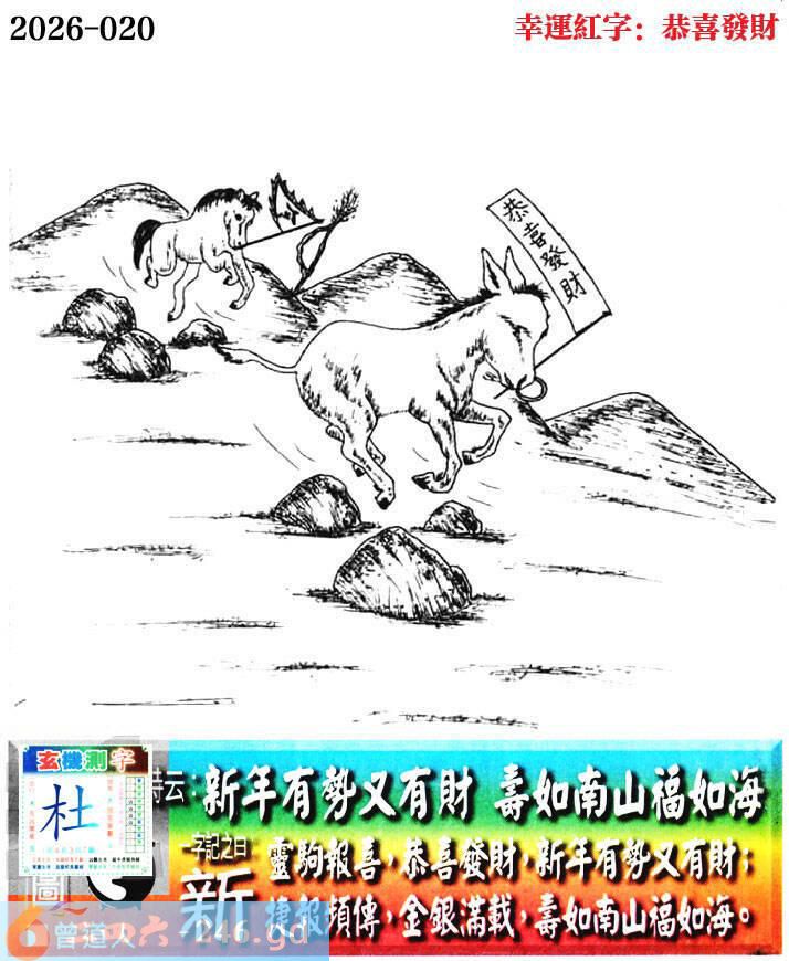 2026年2月21日020期侯(庚申(炉中火) 020期:老版跑狗玄機一字記之曰:【新】 詩云:新年有勢又有財壽如南山福如海 靈駒報喜,恭喜發財,新年有勢又有財; 捷報頻傳,金銀滿載,壽如南山福如海。 玄機測字:《杜》 密圖詩:一男一女相伴隨 《記》:一左一右都是二 特碼大小單雙句:三心二意相互應 今期必中:貂禪 020期:特碼歇后語 河里捉王八-----(捉)作弊(鳖) 020期四字梅花诗:言不由衷。 020期火车头:烧伤猪。诗:龙死马伤,三六一二比短长。 020期香港第一手欲钱料:蛇。 020期曾道人说:“年月日?” 020期另版四字梅花诗:三番五次。 020期香港第一手欲钱料:欲钱看一九九八年第一百三十期。 020期曾道人说:“为什么电视没冇天线还可以正常播放”? 020期:二字經:人間 020期:夏至是特码 020期:智力金壤;杏雨梨云 020期:信箱紅字:【攀炎附熱】 020期:【暗碼:21-35-41-46】 020期:一語中特:【六六無窮】 發財玄機圖:變化多端窗外風景圖中明龍藍綠 020期:藏寳圖 新:可能同读远游无 老:坐客无毡醉不知 禁:猴禁:7尾玄機字《套》 2026年020期【生活幽默】版 〖快樂的寡婦〗 劇院開戲前,一群美國中老年婦女嘻哈聊天,好不熱鬧。 其中一位覺得同伴太吵,有點過意下去,便對身旁的布朗先生道歉:"對不起,我們實在太快樂了。你知道嗎?我認識她們好幾十年了,她們的先生都去世了。他們自稱快樂的寡婦,每年自組出外旅游玩一玩。我一直很想加入這個團體,可是,一直至今年春天,我才具備入會的資格。"