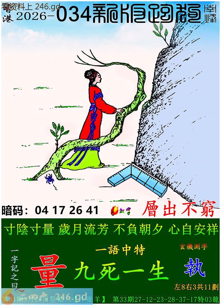 034期跑狗一字記之曰:【量】 寸陰寸量,歲月流芳。 不負朝夕,心自安祥。 玄機測字:《執》 一語中特:九死一生