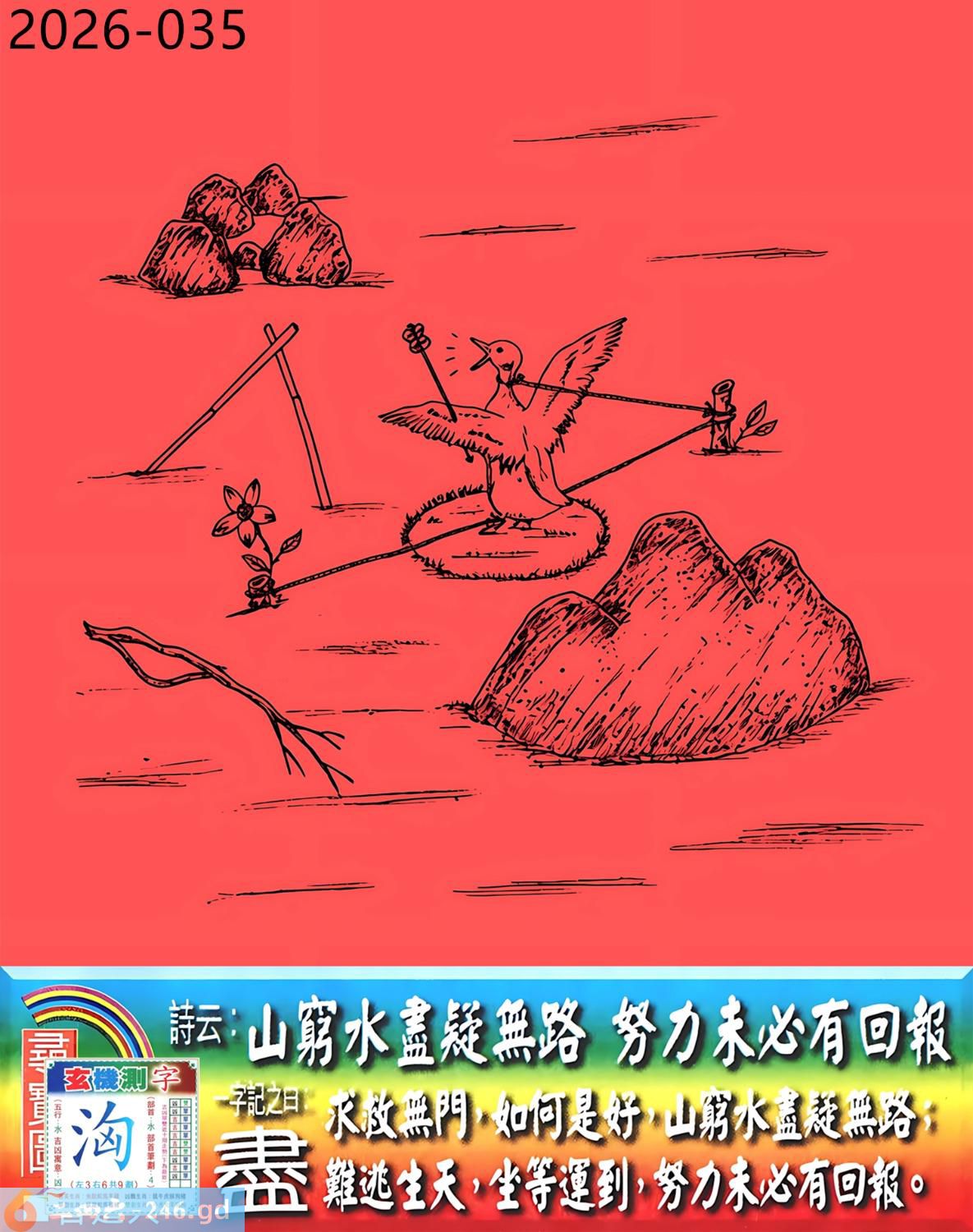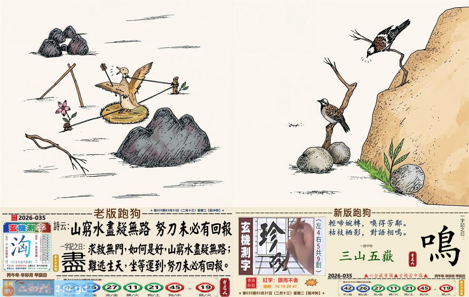 2026年3月31日二月十三星期二覆灯火龙日冲狗 035期:老版跑狗玄機一字記之曰:【盡】 詩云:山窮水盡疑無路,努力未必有回報。 求救無門,如何是好,山窮水盡疑無路; 難逃生天,坐等運到,努力未必有回報。 玄機測字:《洶》 密圖詩:一對核桃一對棗 記:試看宮中有月兔 特碼大小單雙句:伸手要錢 今期必中:黃月英 035期:特碼歇后語 千眼佛-----瞒不过 035期正版四字梅花诗:六根清净。 035期火车头:烧伤鸡。诗:牛死马伤,没有四脚水上走。 035期香港第一手欲钱料:三点。 035期曾道人说:“男人?” 035期另版四字梅花诗:农行理财。 035期香港第一手欲钱料:欲钱台湾金二角的大小。 035期曾道人说:“为什么年轻人喜欢开跑车”? 035期:二字经:红绿。 035期:床下有特码 035期:智力金壤:庖丁解牛 035期紅字:【鍥而不舍】 035期暗码:【16192047】 035期一語中特:【三山五嶽】 發財玄機圖:探索周圍儲備充足圖中明鼠藍綠 035期:藏寶圖 新:蕉留庭户因供字 老:日长暗记残香篆 禁:蛇禁:8尾玄機字《渐》 2026年035期【生活幽默】版 〖狗明星〗 有一天有一個人帶着一條狗到唱片公司,他説他是這條狗的經纪人,并說他這條狗會唱歌跳舞,老板不相信,就叫小狗表演一次。當音樂響起,小狗跟着音樂載歌載舞,老板目瞪口呆的看着小狗,一邊想着這一次撿到摇錢樹了,就趕快拿出合同希望與狗簽約,没想到忽然一條大狗衝進來,把小狗銜走了。 老板問:"怎磨回事?"經纪人無奈的表 示:"唉!那是他媽媽,他媽媽希望他兒子成爲一名醫生,演藝圈太復雜了!