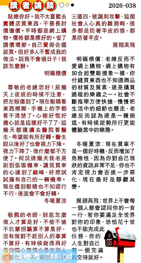 第038期讀者論談 1.貼總你好。我不太喜歡去實體店買東西,不善長討價還價。平時都是網上購物。價格都是標好的。省了講價環節。自己覺得合適就買。但好多人不暫成我的做法。説我不會過日子!我該怎麼辦。明碼標價 〖明碼標價〗:老總反而不愛網上購物,網上購物有如合起雙眼摸象一樣,你付錢買東西也不知道商品的材質及質素,這是購買過程的樂趣之一。社會不斷推舉方便快捷,慢慢把生活中的細節也磨走,老總反而認為這是一種倒退,有時候逆勢所行更能體驗當中的樂趣。 2.尊敬的老總您好!前幾天上夜班的時候不注意,把左眼傷到了。現在眼睛看東西模糊,手機上的字都看不清楚了。心裡好慌好擔心就是這樣好不了了,這幾天都連續去醫院看醫生,希望能有所好轉。醫生説以後好了也會視力下降。視力下降了,做什麼都不方便了。何況這幾天我老是刷到張雪機車,讓我買車的心達到了巅峰,好想試試擁有自己的一輛機車。現在傷到眼睛也不知道行不行,後面會不會好轉。冬暖夏涼 〖冬暖夏涼〗:現在買車不是一個好時機,反而增加了危險性,因為你對自己現狀的資訊非常不足,你也不肯定視力會否進一步惡化,現在最好是靜觀其變。 3.敬佩的老師,到底怎麼做人才算是好,不偷不搶不坑蒙拐騙算不算是好,沒有做對不起别人的事算不算好,有時候做得再好做的問心無愧也是在別人眼裡低人一等,總被小人説三道四,被諷刺攻撃,這個社會人心真的難測啊,很多都是防著羊皮的狼,都是防著羊皮。展翅高飛 〖展翅高飛〗:世界上不會每一個人都會認同你的一言一行,若你要滿足全世界對你的印象,恐怕花十世也不能完成此任務,你的人生對自己有一個完滿的交待就好。
