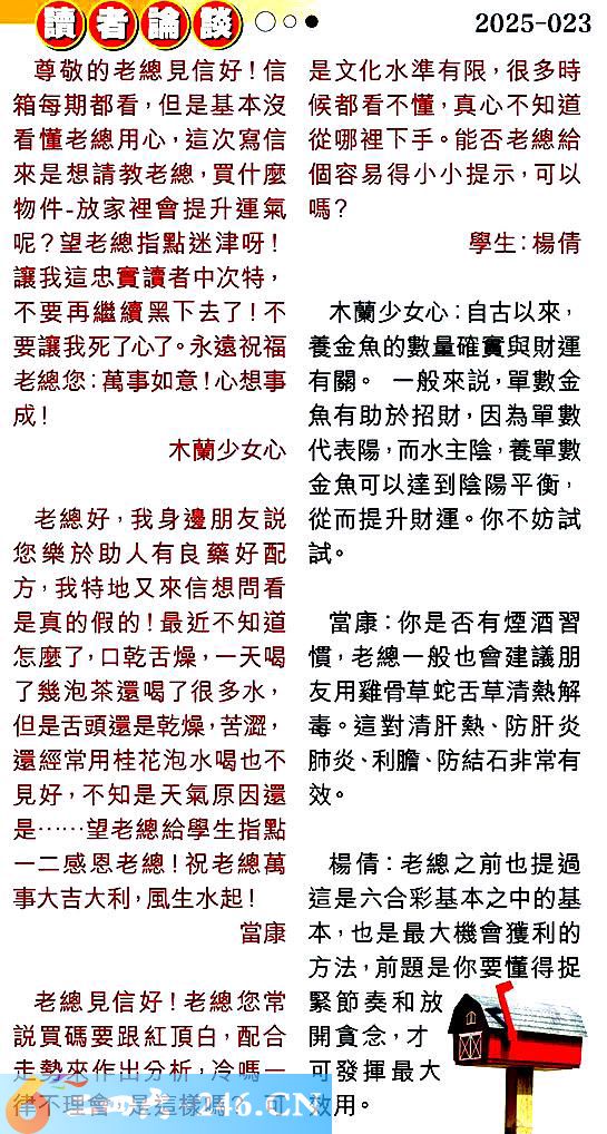 第零二三期讀者論談 1.尊敬的老總見信好!信箱每期都看,但是基本沒看懂老總用心,這次寫信來是想請教老總,買什麼物件-放家裡會提升運氣呢?望老總指點迷津呀!讓我這忠實讀者中次特,不要再繼續黑下去了!不要讓我死了心了。永遠祝福老總您:萬事如意!心想事成!木蘭少女心 〖木蘭少女心〗:自古以來,養金魚的數量確實與財運有關。一般來說,單數金魚有助於招財,因為單數代表陽,而水主陰,養單數金魚可以達到陰陽平衡,從而提升財運。你不妨試 2.老總好,我身邊朋友說您樂於助人有良藥好配方,我特地又來信想問看是真的假的!最近不知道怎麼了,口乾舌燥,一天喝了幾泡茶還喝了很多水,但是舌頭還是乾燥,苦澀,還經常用桂花泡水喝也不見好,不知是天氣原因還......望老總給學生指點一二感恩老總!!祝老總萬事大吉大利,風生水起!當康 〖當康〗:你是否有煙酒習慣,老總一般也會建議朋友用雞骨草蛇舌草清熱解毒。這對清肝熱、防肝炎肺炎、利膽、防結石非常有效。 3.老總見信好!老總您常說買碼要跟紅頂白,配合走勢來作出分析,冷嗎一律不理會,是這樣嗎?可是文化水準有限,很多時候都看不懂,真心不知道從哪裡下手。能否老總給個容易得小小提示,可以嗎?學生:楊倩 〖楊倩〗:老總之前也提過這是六合彩基本之中的基本,也是最大機會獲利的方法,前題是你要懂得捉緊節奏和放開貪念,才可發揮最大效用。