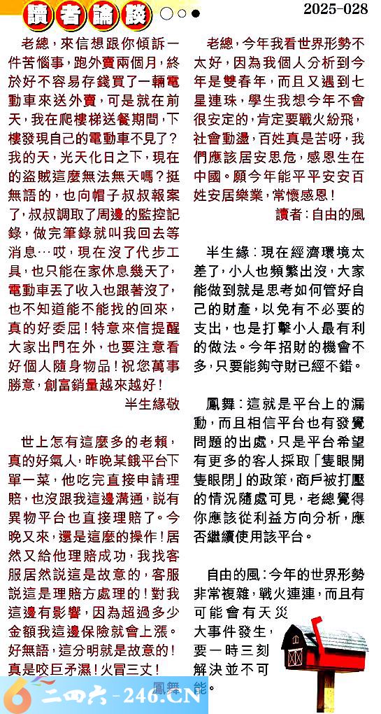1.老總,來信想跟你傾訴一件苦惱事,跑外賣兩個月,終於好不容易存錢買了一輛電動車來送外賣,可是就在前天,我在爬樓梯送餐期間,下樓發現自己的電動車不見了?我的天,光天化日之下,現在的盜賊這麼無法無天嗎?挺無語的,也向帽子叔叔報案了,叔叔調取了周邊的監控記錄,做完筆錄就叫我回去等消息.哎,現在沒了代步工具,也只能在家休息幾天了,電動車丟了收入也跟著沒了,也不知道能不能找的回來,真的好委屈!特意來信提醒大家出門在外,也要注意看好個人随身物品!祝您萬事勝意,創富銷量越來越好!半生緣敬