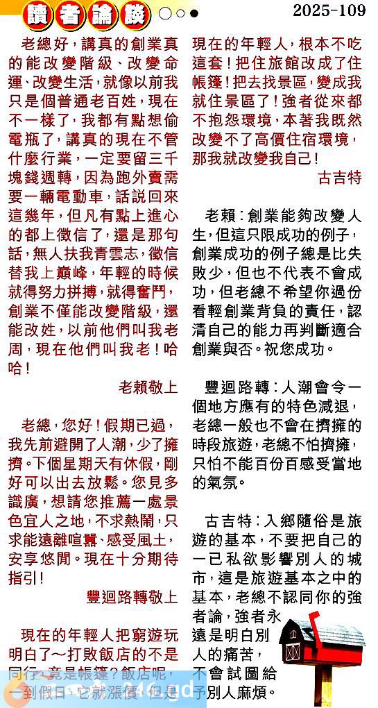 第一零九期讀者論談 1.老總好,講真的創業真的能改變階級、改變命運、改變生活,就像以前我只是個普通老百姓,現在不一樣了,我都有點想偷電瓶了,講真的現在不管什麼行業,一定要留三千塊錢週轉,因為跑外賣需要一輛電動車,話說回來這幾年,但凡有點上進心的都上微信了,還是那句話,無人扶我青雲志,徵信替我上巔峰,年輕的時候就得努力拼搏,就得奮鬥,創業不僅能改變階級,還能改姓,以前他們叫我老周,現在他們叫我老!哈哈!老賴敬上 〖老賴〗:創業能夠改變人生,但這只限成功的例子,創業成功的例子總是比失敗少,但也不代表不會成功,但老總不希望你過份看輕創業背負的責任,認清自己的能力再判斷適合創業與否。祝您成功。 2.上老總,您好!假期已過,我先前避開了人潮,少了擁擠。下個星期天有休假,剛好可以出去放鬆。您見多識廣,想請您推薦一處景色宜人之地,不求熱鬧,只求能遠離喧囂、感受風土,安享悠閒。現在十分期待指引!豐迴路轉敬上 〖豐迴路轉〗:人潮會令一個地方應有的特色減退,老總般也不會在擠擁的時段旅遊,老總不怕擠擁,只怕不能百份百感受當地的氣氛。 3.現在的年輕人把窮遊玩明白了打敗飯店的不是同行,竟是帳篷?飯店呢,一到假日,它就漲價,但是現在的年輕人,根本不吃這套!把住旅館改成了住帳篷!把去找景區,變成我就住景區了!強者從來都不抱怨環境,本著我既然改變不了高價住宿環境,那我就改變我自己!古吉特 〖古吉特〗:入鄉隨俗是旅遊的基本,不要把自己的一已私欲影響別人的城市,這是旅遊基本之中的基本,老總不認同你的強者論,強者永遠是明白別人的痛苦,不會試圖給予別人麻煩。