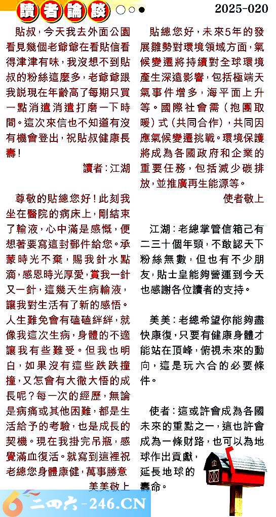 1.貼叔,今天我去外面公園看見幾個老爺爺在看貼信看得津津有味,我沒想不到貼叔的粉絲這麼多,老爺爺跟我說現在年齡高了每期只買一點消遣消遣打磨一下時間。這次來信也不知道有沒有機會登出,祝貼叔健康長壽!讀者:江湖