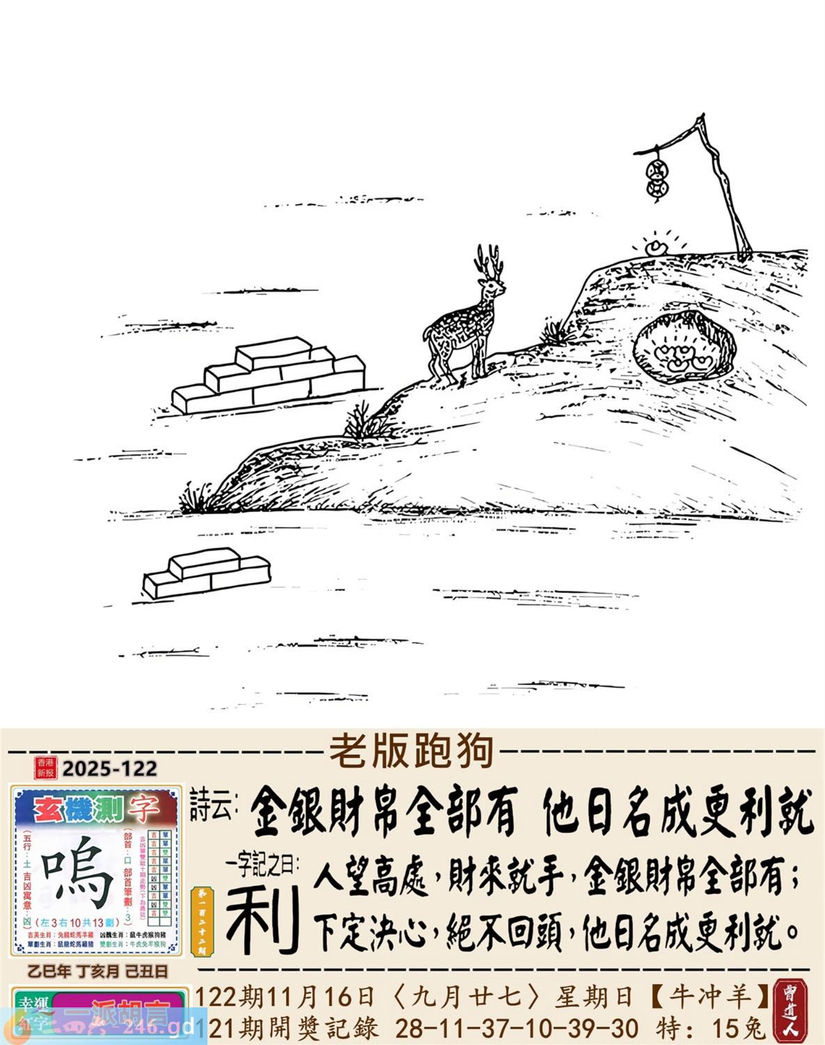 2025年11月16日122期羊(癸未)(霹雷火) 122期:老版跑狗玄機一字記之曰:【利】 詩云:金銀財帛全部有他日名成更利就 人望高處,財來就手,金銀財帛全部有; 下定決心,絕不回頭,他日名成更利就。 玄機測字:《鳴》 密圖詩:一口咬定八當寶 《記》:三思而行四方面 特碼大小單雙句:人前人后各一套 今期必中:孫策 122期:特碼歇后語 当了衣裳打酒喝-----顾嘴不顾身 122期正版四字梅花诗:十全十美。 122期火车头:烧伤狗。诗:羊死鸡伤,开过一门又一门。 122期香港第一手欲钱料:村夫俗子。 122期曾道人说:“王老吉?” 122期另版四字梅花诗:盖世豪情。 122期香港第一手欲钱料:欲钱看西游记第三回。 122期曾道人说:“男人三十喝酒时喜欢做什么事”? 122期:二字經:三十 122期:平果是特码 122期:智力金壤:勇往直前 122期:信箱紅字:【吹灰之力】 122期:【暗碼:14-21-28-41】 122期:一語中特:【三言兩語】 發財玄機圖:四蹄翻腾精神健旺圖中明馬紅綠 122期:藏寳圖 新:割鲜籍草酒淋漓 老:日暮沙场飞作灰 禁:猴禁:0尾玄機字《将》 2025年122期【生活幽默】版 〖表現很好〗 有一個精神病患者救了一個落水者。 院長非常高興,對這個精神病患者說:“這次你救了一個落水的人,表現很好,但不幸的是他不知道什麽是原因又上吊自殺了。” 精神病很得意的說:“是我把他挂起來要晾幹的!”