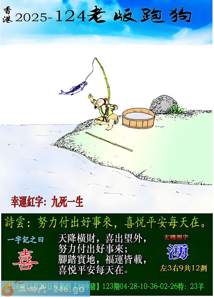 本帖最后由期望于2025-11-2011:37编辑 主12个生肖,49个号。近期看新澳有点希望,懒得理香菜了。久疏战阵跑狗基本不会了。蒙49个号12肖应中 124期老版跑狗一字記之曰:【喜】 詩雲:努力付出好事來,喜悦平安每天在。 天降橫財,喜出望外,努力付出好事來; 腳踏實地,福運皆載,喜悦平安每天在。 玄機測字:《湧》