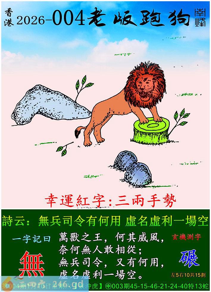 004期老版跑狗一字記之曰:【無】 詩雲:無兵司令有何用,虛名虛利一場空。 萬獸之王,何其威風,奈何無人敢相從; 無兵司令,又有何用,虛名虛利一場空。 玄機測字:《碾》