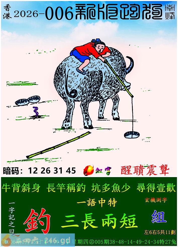006期跑狗一字記之曰:【釣】 牛背斜身,長竿稱釣。 坑多魚少,尋得壹歡。 玄機測字:《組》 一語中特:三長兩短