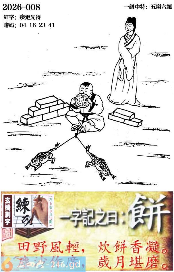 008期跑狗一字記之曰:【餅】 田野風輕,炊餅香凝。 塵沙作席,歲月堪磨。 玄機測字:《練》 一語中特:五窮六絕