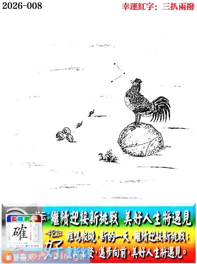 008期老版跑狗一字記之曰:【好】 詩雲:繼續迎接新挑戰,美好人生將遇見。 雞鳴報曉,新的一天,繼續迎接新挑戰; 重新出發,邁步向前,美好人生將遇見。 玄機測字:《確》