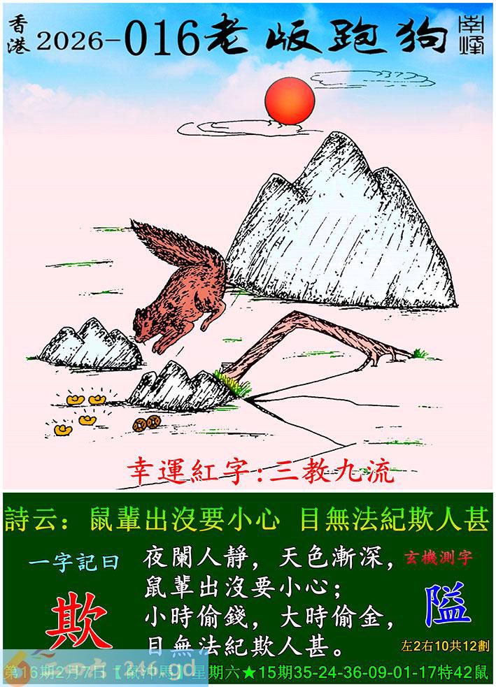 016期老版跑狗一字记之曰:【欺】 诗云:鼠辈出没要小心,目无法纪欺人甚。夜阑人静,天色渐深,鼠辈出没要小心; 小时偷钱,大时偷金,目无法纪欺人甚。 1、小时偷钱(针),大时偷金。这里是笔误,还是有意为之?2、鼠辈之流并不是什么好鸟。3、若真是贼子小偷,为啥非要用两句话强调“夜阑人静,天色渐深”?白天不偷?4、目无法纪欺人太甚了,是不是很嚣张狂妄?