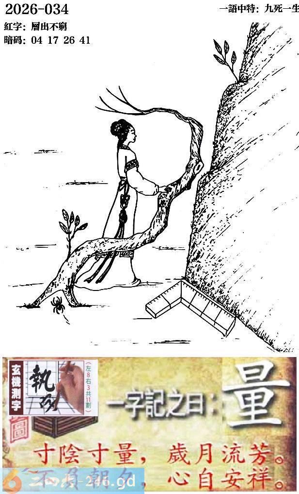 034期跑狗一字記之曰:【量】 寸陰寸量,歲月流芳。 不負朝夕,心自安祥。 玄機測字:《執》 一語中特:九死一生